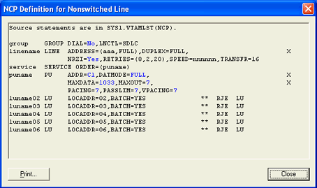 When you finish configuring the communication links on the Communication Link tab, click NCP and Physical Unit to view sample statements the host programmer needs to enter in the host VTAM and NCP parameter libraries. The host programmer must set certain host parameters for BARR/RJE to operate. An existing remote definition used for other RJE equipment might not work with BARR/RJE. You will save time and effort getting your system running if you adhere to the recommended host definition. You can print these screens for the host programmer by clicking Print on the NCP or Physical Unit dialog box.