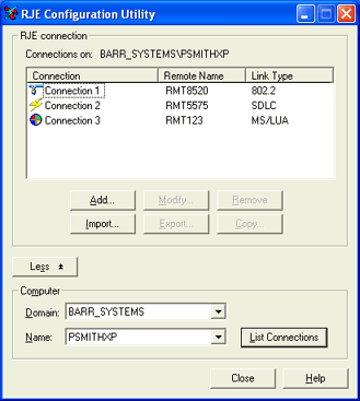 List Connections button – Connects the utility to the selected computer. All connections defined on that computer are displayed in the RJE connection box. If there are no connections defined on the selected computer, the RJE connection box will display the following message: No connections defined.