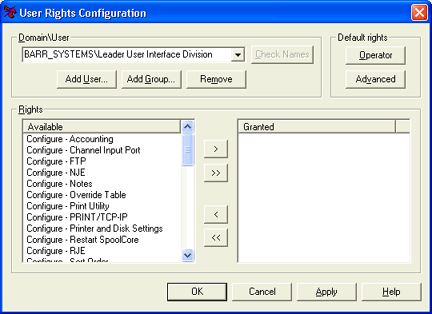 For each user or group, rights are either available or granted. Rights can be added or removed by moving the item from one column to another. The Using the User Rights Configuration utility topic can help you get started.