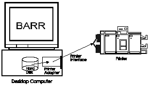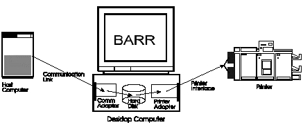 Regardless of differences between your configuration and the diagram above, the basic concept does not change. The diagram shows that two distinct processes occur: the Barr software (1) receives data from a source or host over some type of communication link and (2) sends the data to some kind of destination, usually over a printer interface.