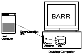 Configurations can be very different from one site to the next. In the diagram, generic labels represent components that vary widely, such as the communication link or printer interface. In your case, the data flow may also differ somewhat. For instance, your data may not write to the hard disk if you do not use the Barr Print Spool feature, or your data may not go to a printer but to a different destination, such as a tape drive.