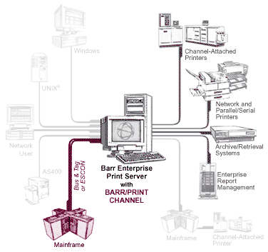 BARR/PRINT CHANNEL is a software and hardware module of the Barr Enterprise Print Server that allows you to physically connect your Windows-based computer to your mainframe channel. It emulates multiple mainframe-attached printers and is a relatively simple method of printing from the mainframe to your local network printers.