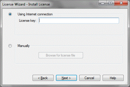 The License Wizard is used to install new licenses and to activate licenses. If an Internet connection is available, installing and activating a license is a very easy process. If an Internet connection is not available, there is a manual process available.