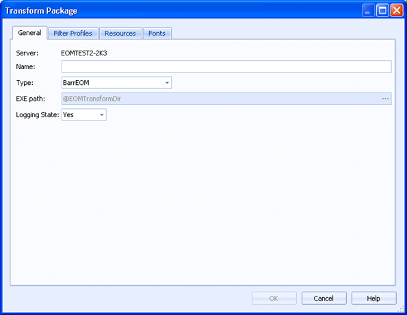 Specifies the EXE path. For the Barr EOM and IPDS transform types the EXE path is automatically selected, @EOMTransformDir. For the DocBridge and DocBrigeAdvanced transform package types, you must enter the path of the appropriate transform package. You can type the path directly in the box, or click the ellipsis button to select it.