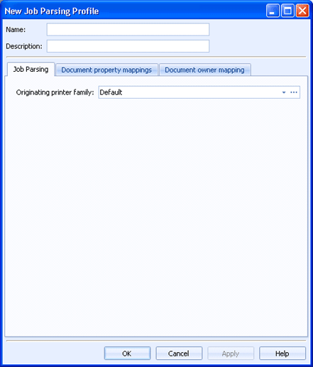 Use the Job Parsing tab to configure job parsing profiles. This profile configures information extracted from Postscript, PDF, and PCL documents.
