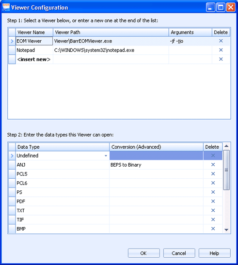 Conversion (Advanced) - Changes record formats of the incoming data, before passing the data to the Viewer utility. Choose if you need to convert files from the Barr Enterprise Print Server (.tnj) file format to one of the following types: binary (.bin), text (.txt), or Xerox (.xrx).