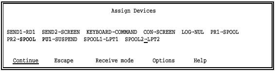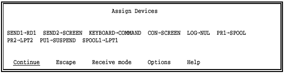 After you make an assignment, the Assign Devices screen is updated to reflect your selection and a menu line displays at the bottom of the screen.