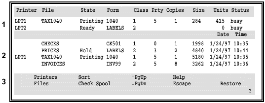 In this example, the TAX1040 file is printing on LPT1. In the spool printer list, TAX1040 displays in the file column. In the file list, Printing displays as the file’s state.